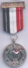 Green Middle stripes 2 mm Instituted: 1987 Awarded: Grades: 1 Class, to commemorate the 25th anniversary of the September 26, 1962 revolution. You can see the hand held torch and the open wings of the Yemen eagle with Arabic inscriptions on the Obverse and the medal title on the Reverse Price: $ 60 Rare |